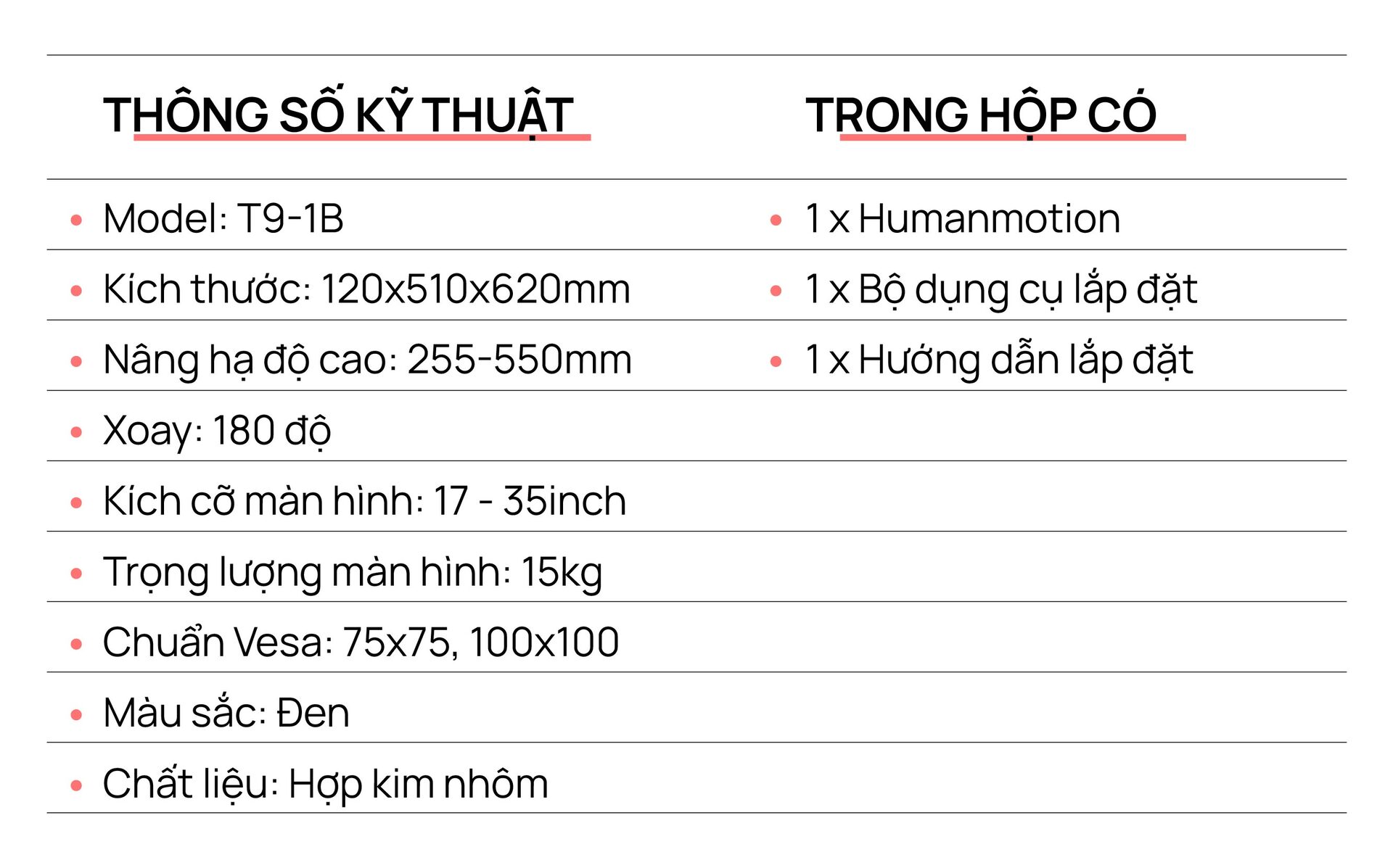 - Kết cấu sản phẩm vô cùng tinh tế, kỹ xảo hiện đại giúp giá treo màn hình Human Motion T9 không có khuyết điểm đối với người dùng hiện tại.