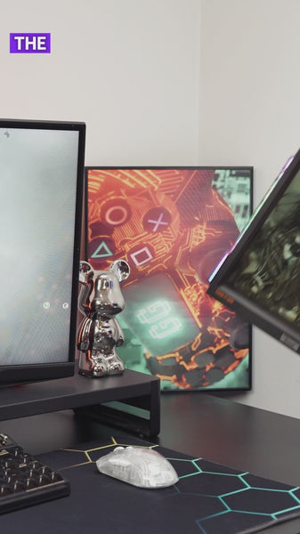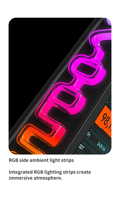 Hệ thống đèn RGB tích hợp dọc khung viền tạo nên hiệu ứng ánh sáng sống động, tăng tính thẩm mỹ cho bất kỳ góc làm việc hay không gian trang trí nào. Ánh sáng lan tỏa nhẹ nhàng, phù hợp mọi phong cách nội thất.