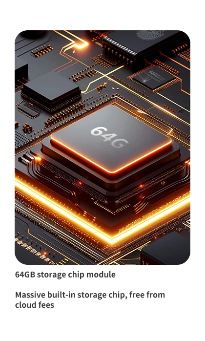 Tích hợp chip lưu trữ 64GB cho phép bạn lưu tới 700.000 ảnh hoặc 4.000 phút video mà không cần trả phí lưu trữ. Dữ liệu luôn sẵn sàng truy cập mọi lúc, hoàn toàn không phụ thuộc vào kết nối internet.