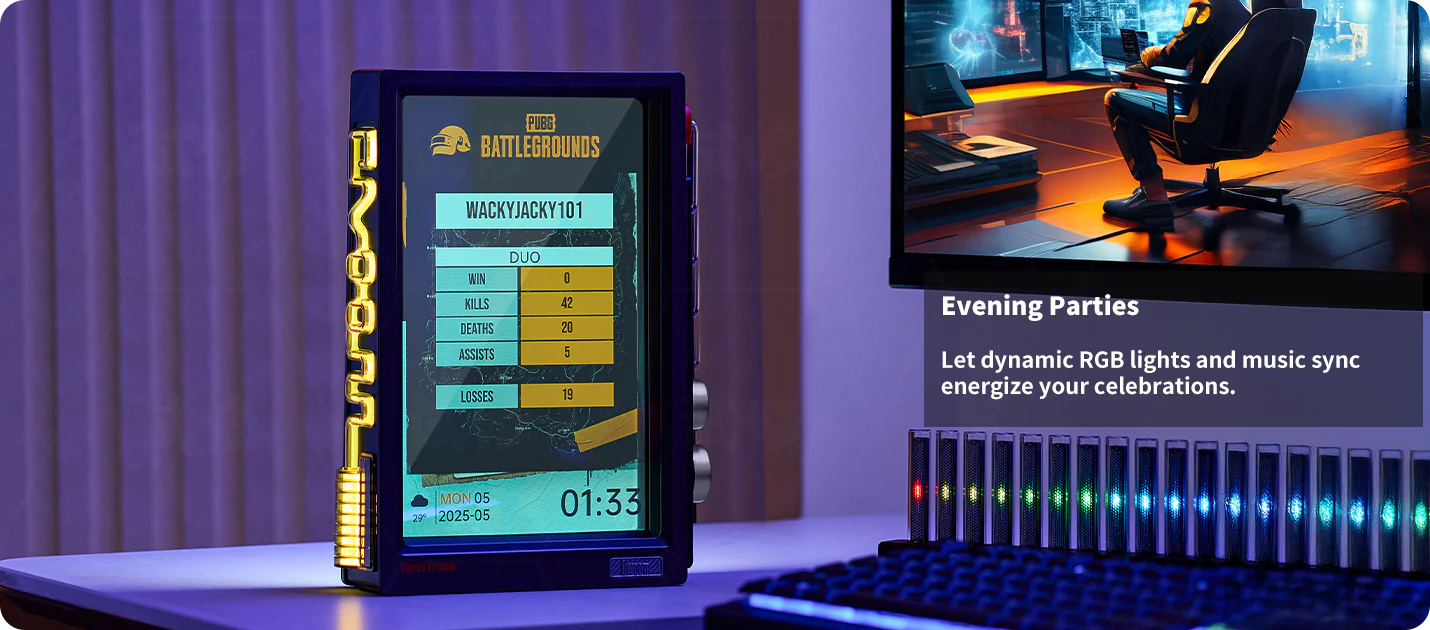Hiển thị tiện ích như đồng hồ, thời tiết, thông báo mạng xã hội giúp theo dõi hiệu quả công việc. Với hiệu ứng đèn RGB, sản phẩm dễ dàng hòa hợp với không gian làm việc hoặc setup gaming sống động .